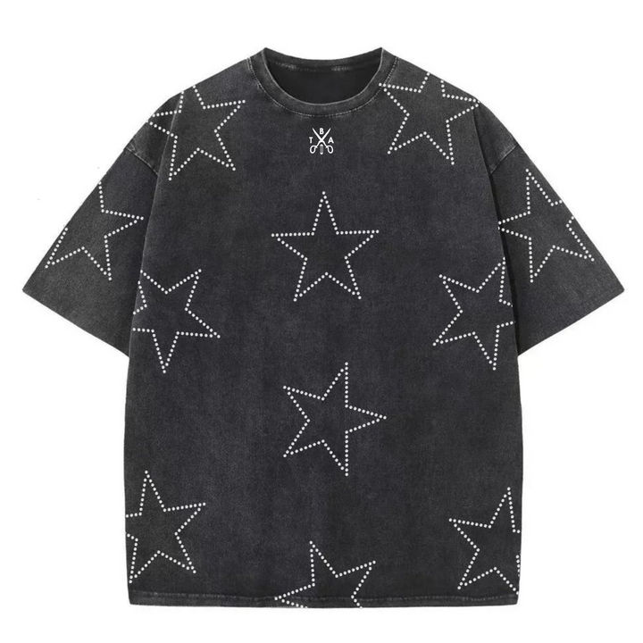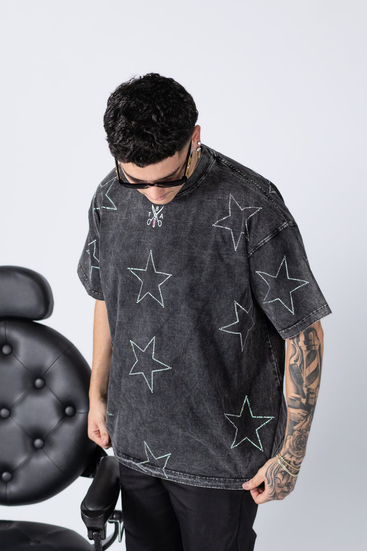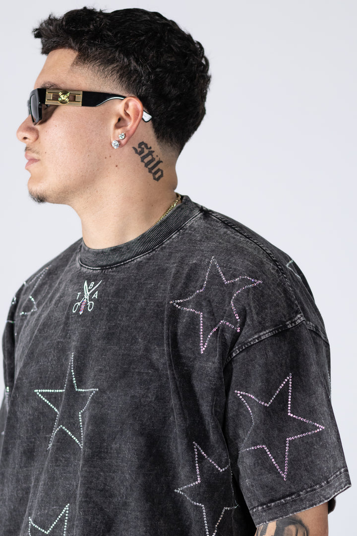 The Chrome Dust tee is a vintage washed black, boxy fit made out of premium 100% heavyweight cotton and true to size. The tee features our signature TBA logo embroidered on the front with scattered rhinestone stars across the shirt, giving it a bold yet timeless edge.